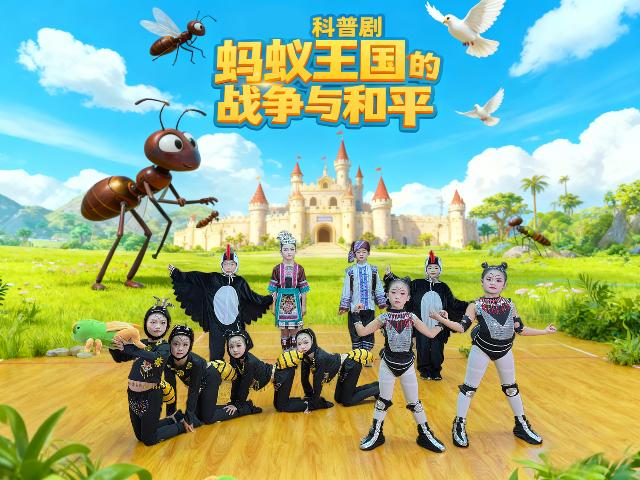 《蚂蚁王国的战争与和平》是一部独具民族风味的原创儿童科普剧,灵感来源于广西龙胜侗族世代传唱的童谣《蚂蚁歌》。剧目生动讲述了侗族孩子“小木”与“小禾”在游戏中,目睹“长鞍蚁”与“羊公蚁”为争夺食物“羊”而爆发冲突,最终凭借智慧化解纷争的奇妙故事。剧目巧妙地将蚂蚁的社群分工(工蚁协作搬运)、信息素通讯(如何发现食物)以及种间竞争(长鞍蚁与羊公蚁的争斗)等科学知识融入剧情。